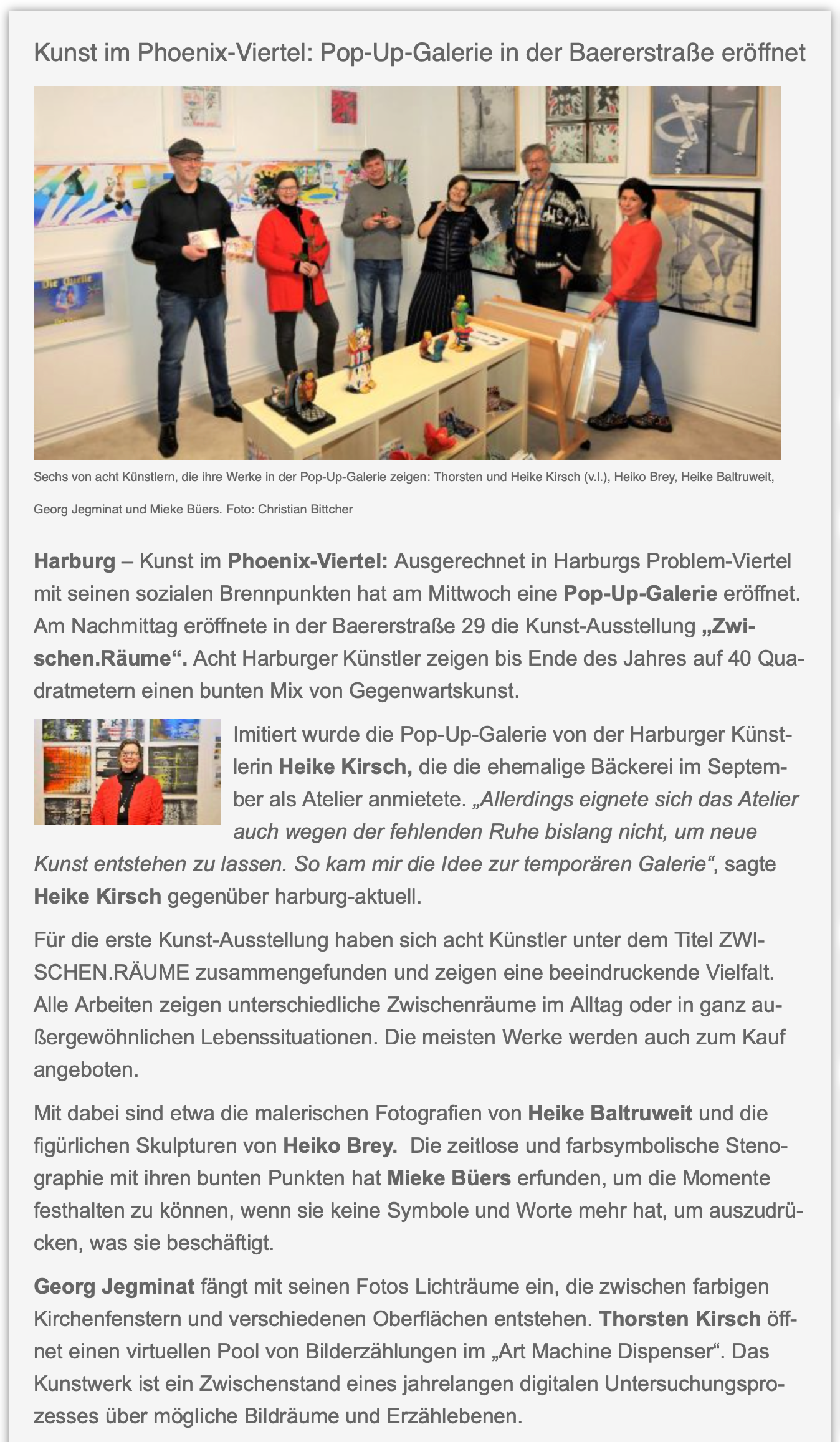 Zwischen dem Bürgerzentrum Feuervogel und der Kunstsammlung Falckenberg befand sich im Phoenix Viertel die neue POPUP.GALERIE.ZWISCHEN.RAUM von Heike Kirsch. Die Galerie präsentierte Gegenwartskunst von Harburger Künstler*innen und Gästen.