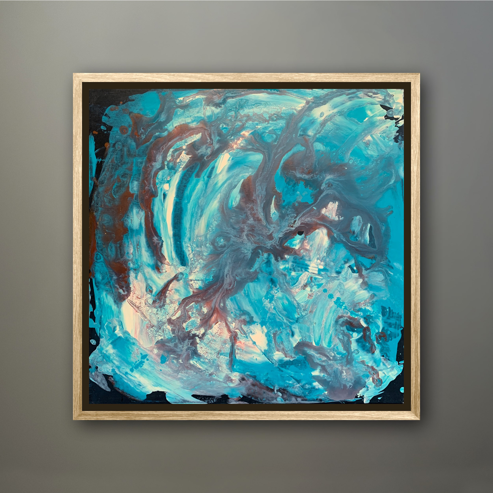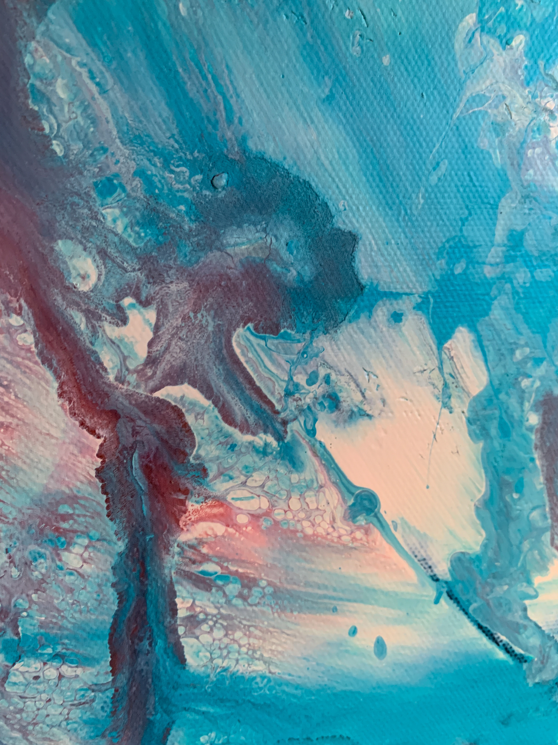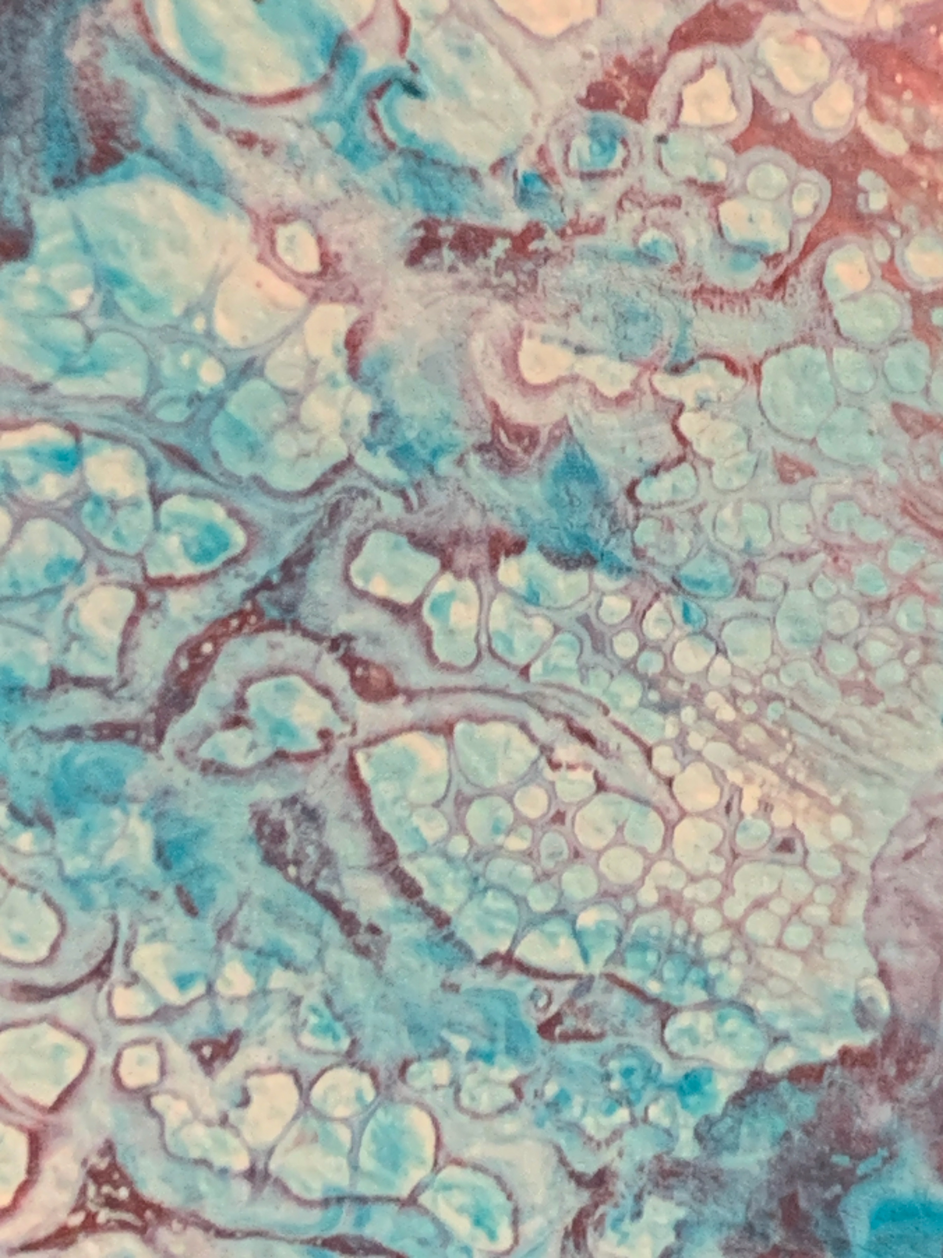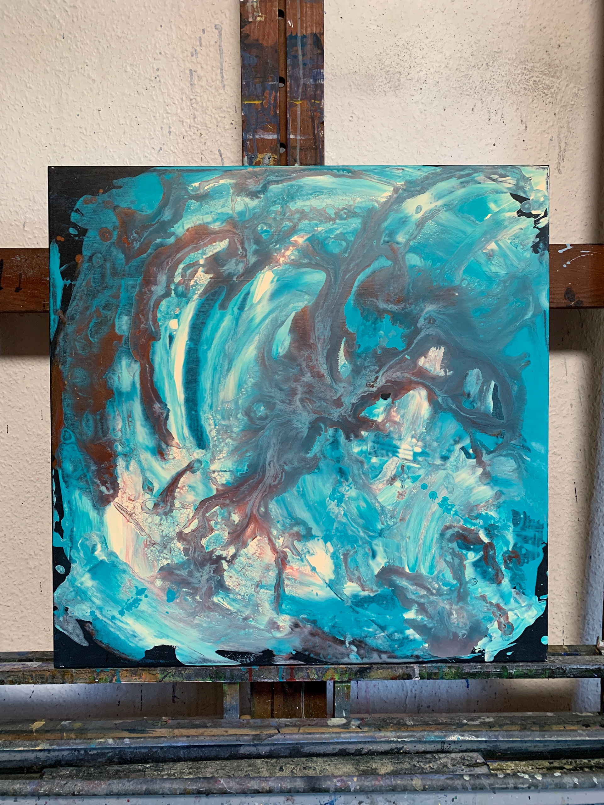 Bei der Herstellung habe ich zunächst die Methode des Acrylic Pouring verwendet und dann die gegossene Acrylfarbe mit einer Spachtel in der Bewegung gesteuert und zusätzlich mit einem Pinsel sowie Auswaschungen verändert. Durch die gezielten Eingriffe hat sich die Zufälligkeit und Willkürlichkeit des Gießens teilweise aufgehoben.