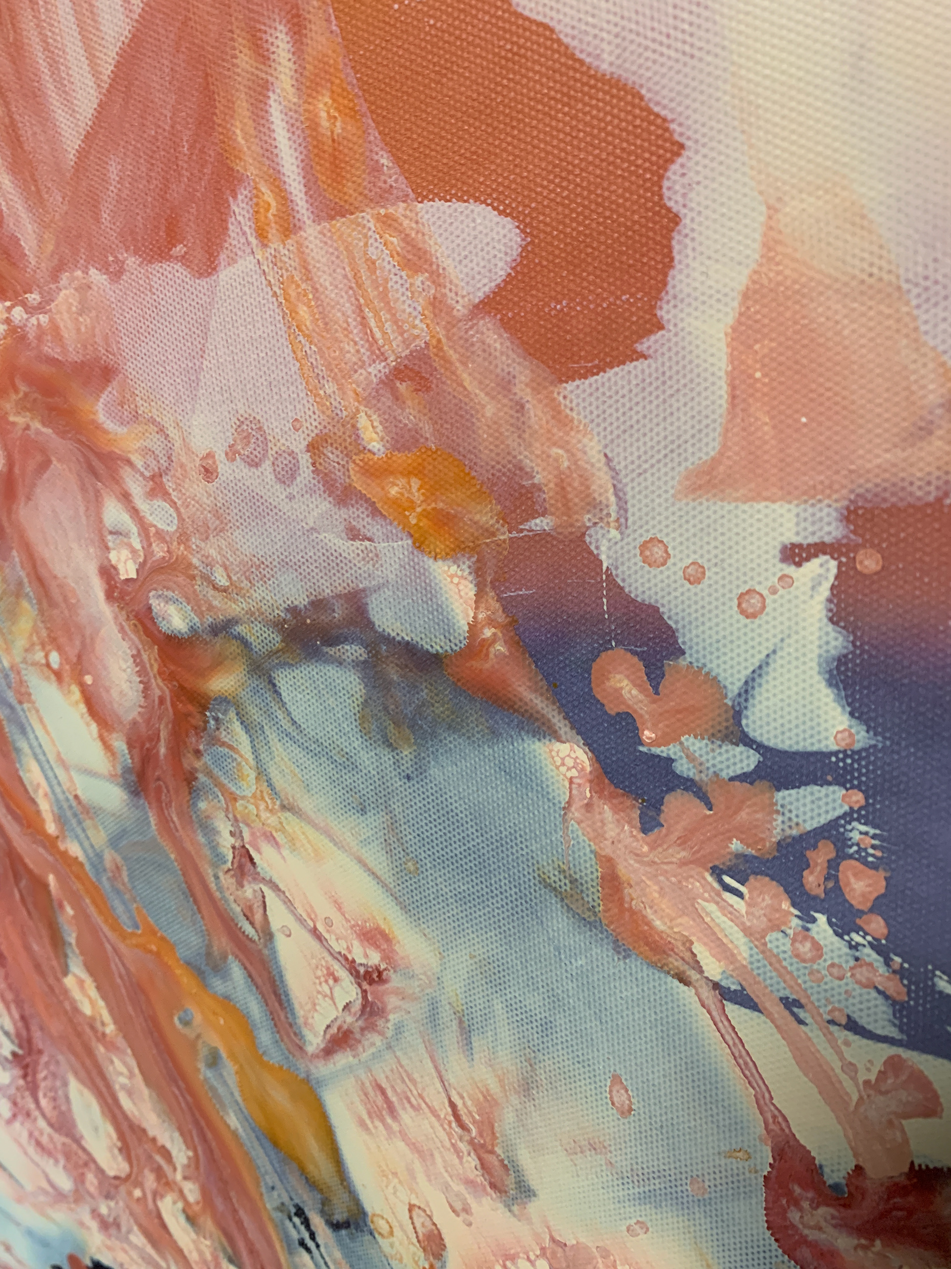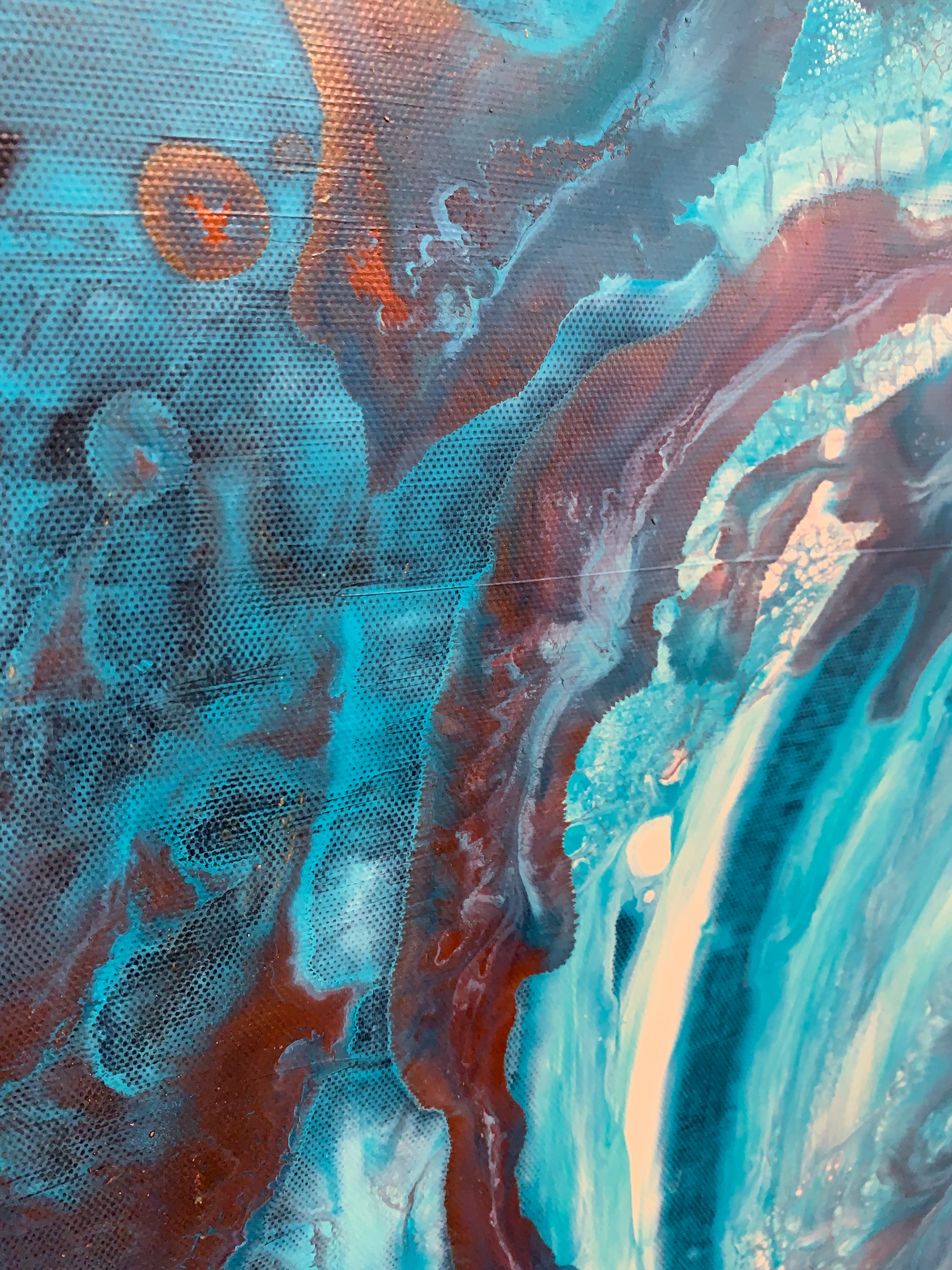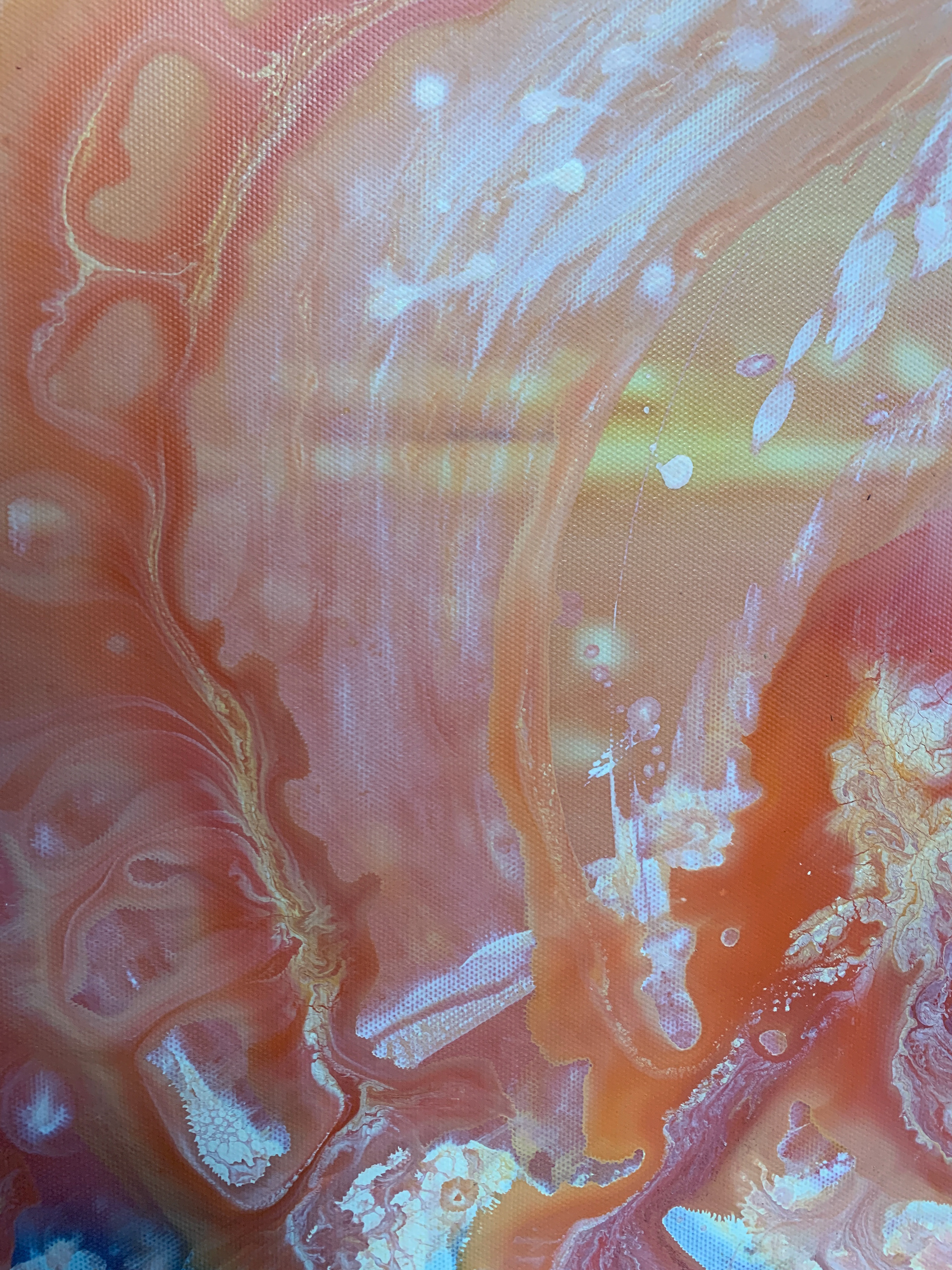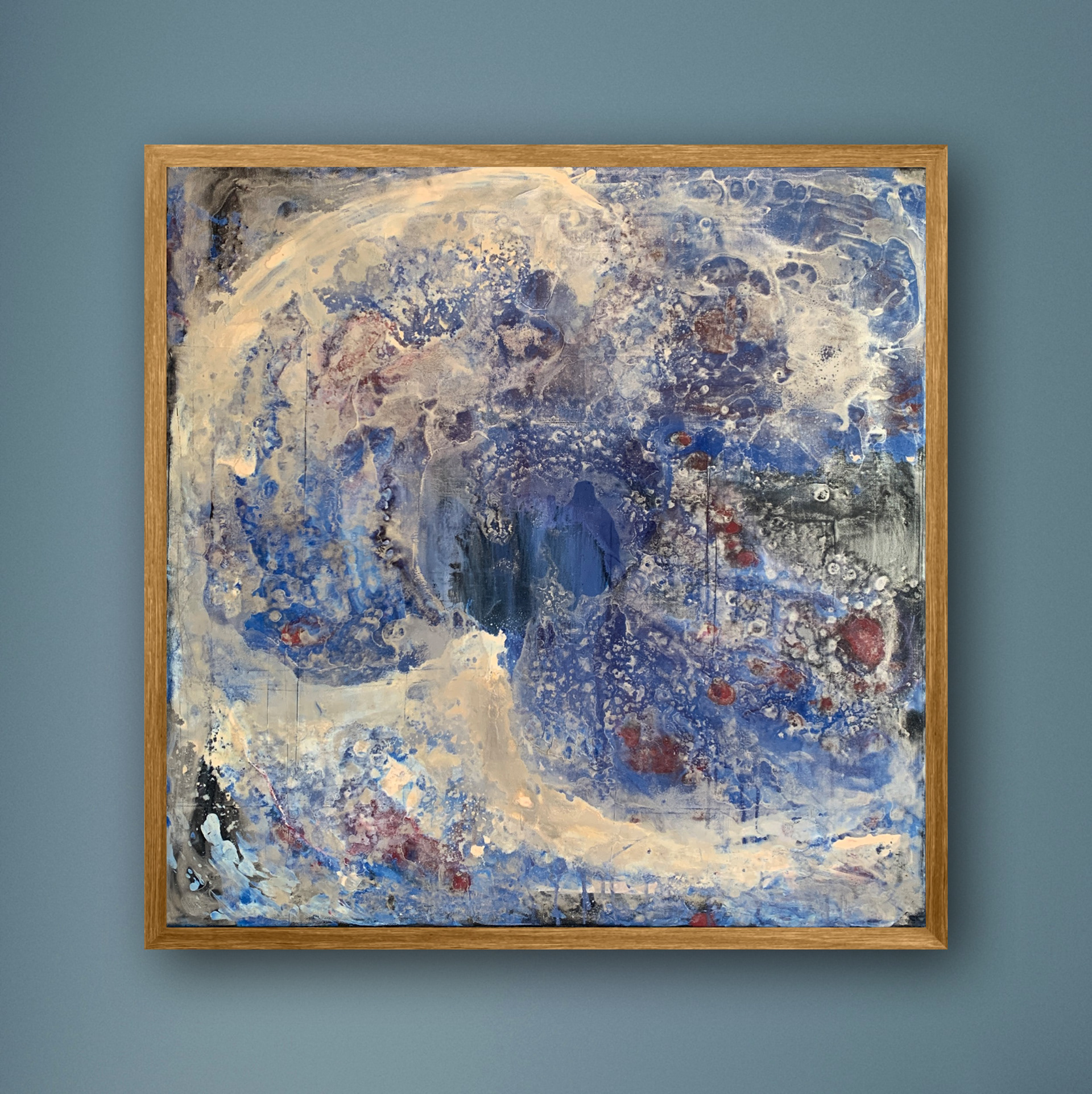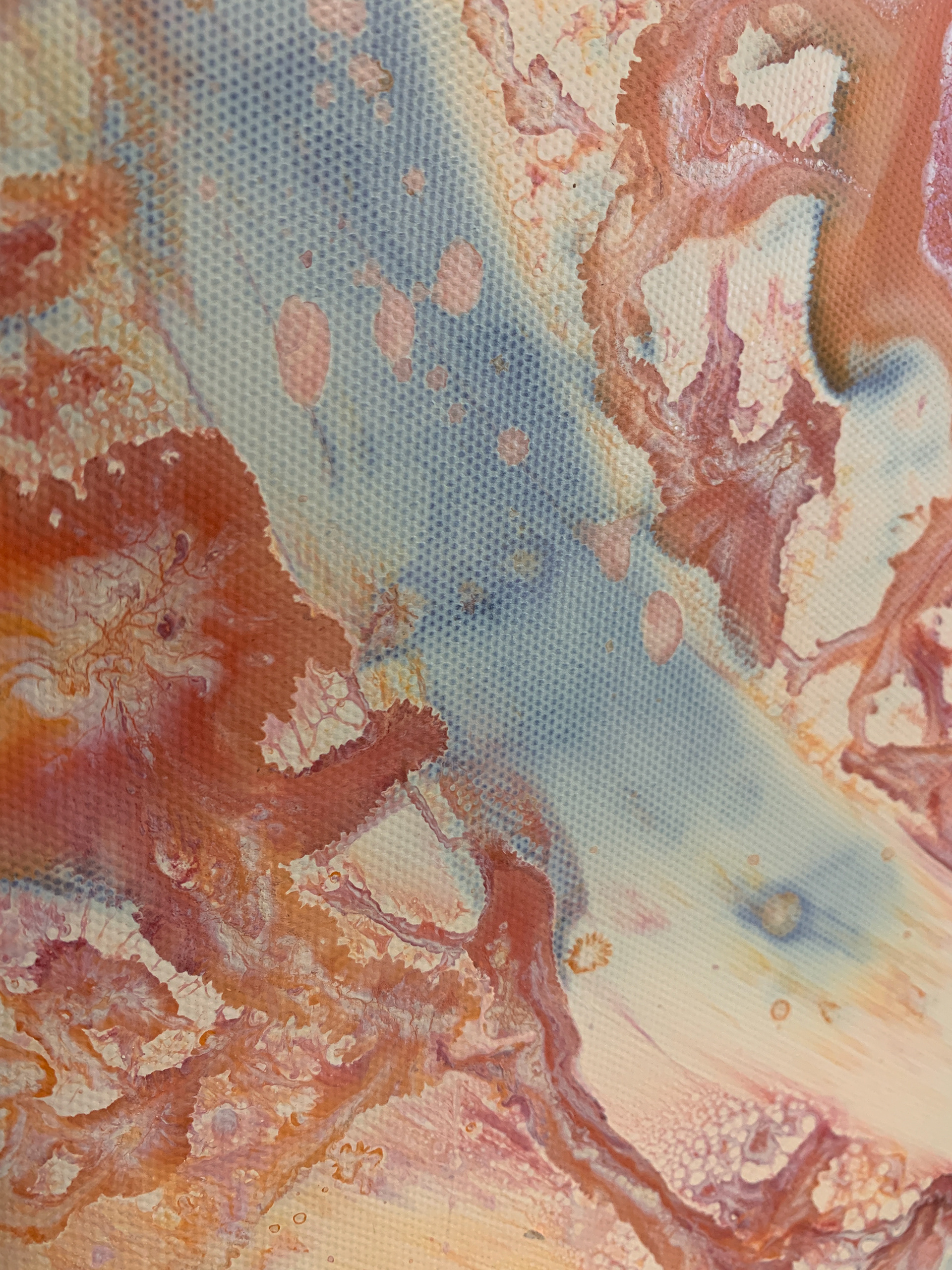 Bei der Herstellung habe ich zunächst die Methode des Acrylic Pouring verwendet und dann die gegossene Acrylfarbe mit einer Spachtel in der Bewegung gesteuert und zusätzlich mit einem Pinsel sowie Auswaschungen verändert. Durch die gezielten Eingriffe hat sich die Zufälligkeit und Willkürlichkeit des Gießens teilweise aufgehoben.