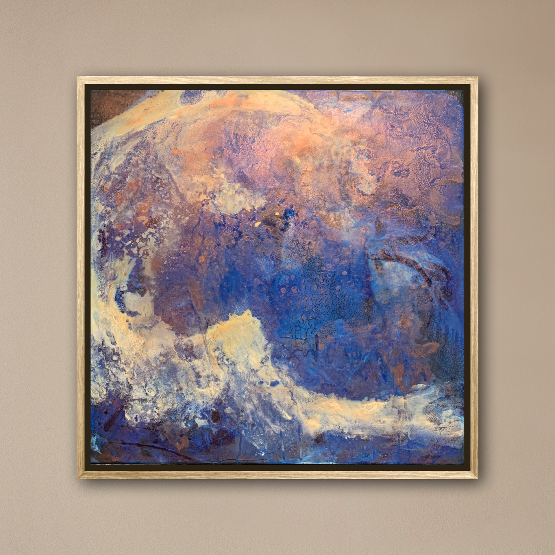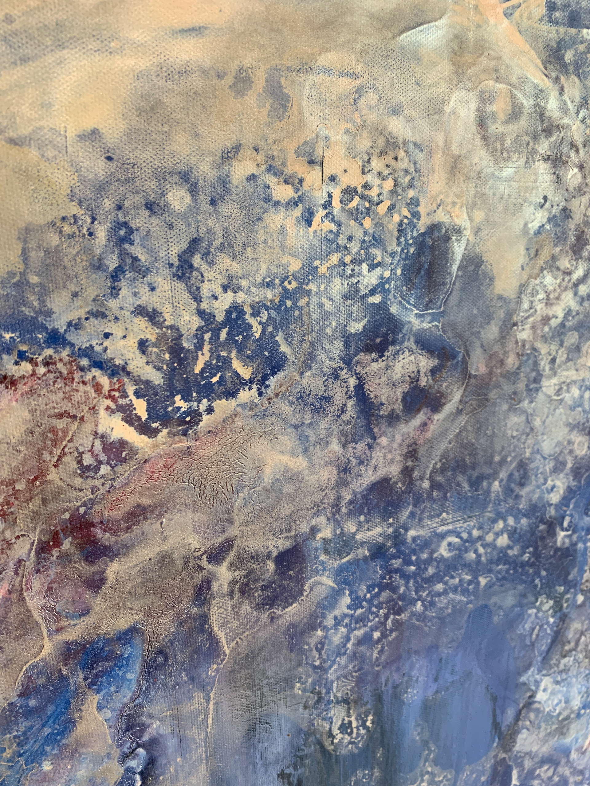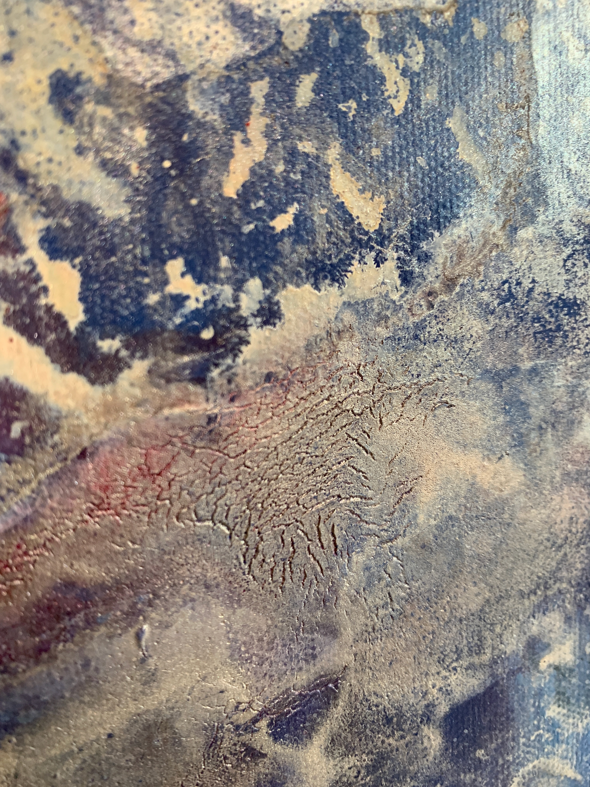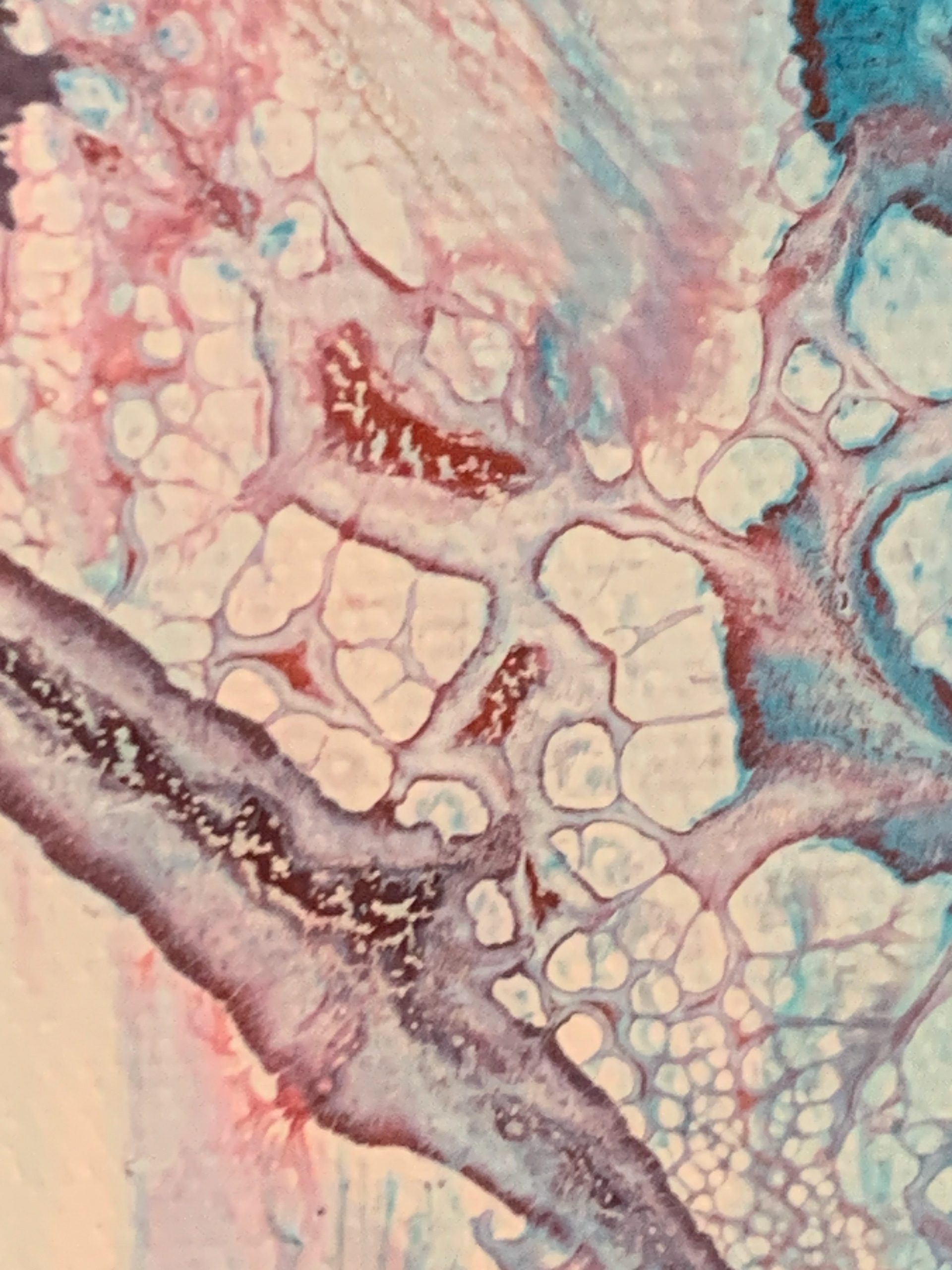 Bei der Herstellung habe ich zunächst die Methode des Acrylic Pouring verwendet und dann die gegossene Acrylfarbe mit einer Spachtel in der Bewegung gesteuert und zusätzlich mit einem Pinsel sowie Auswaschungen verändert. Durch die gezielten Eingriffe hat sich die Zufälligkeit und Willkürlichkeit des Gießens teilweise aufgehoben.