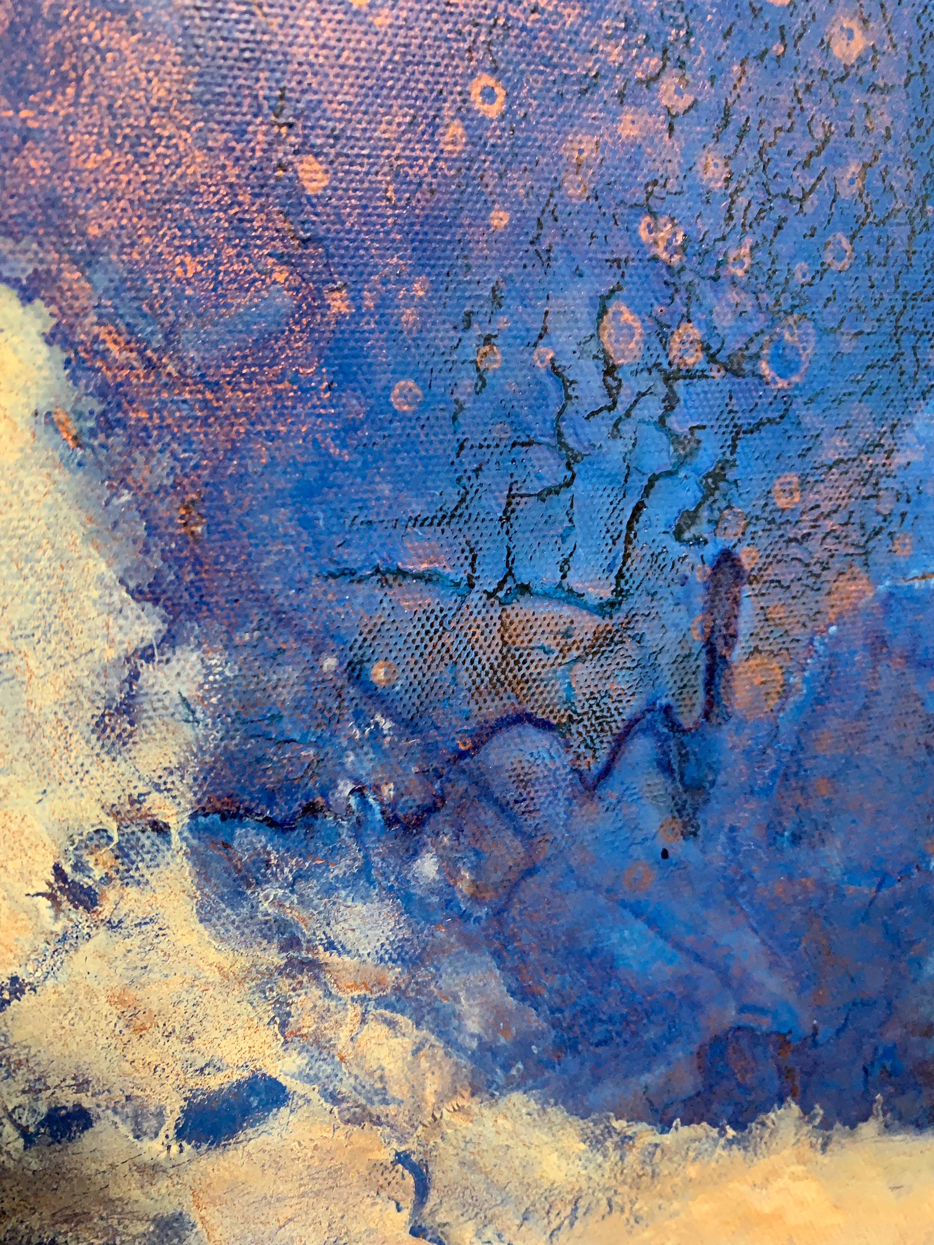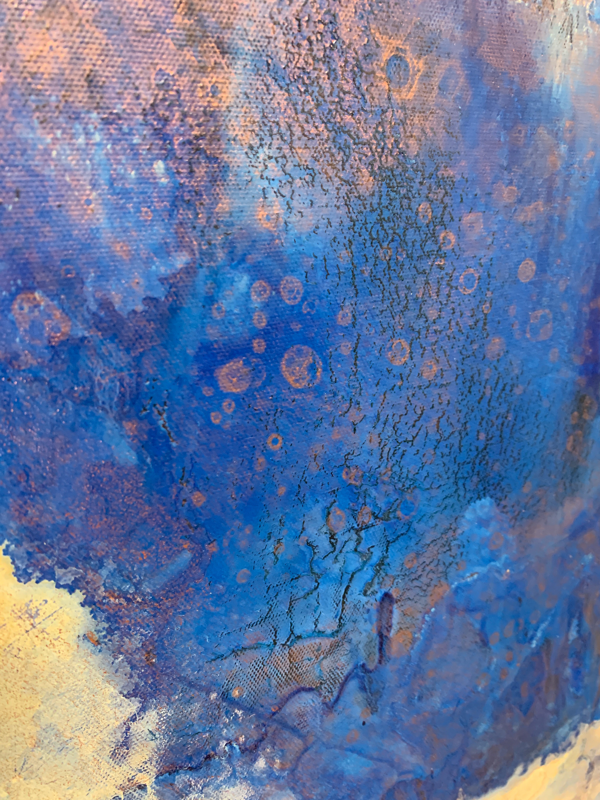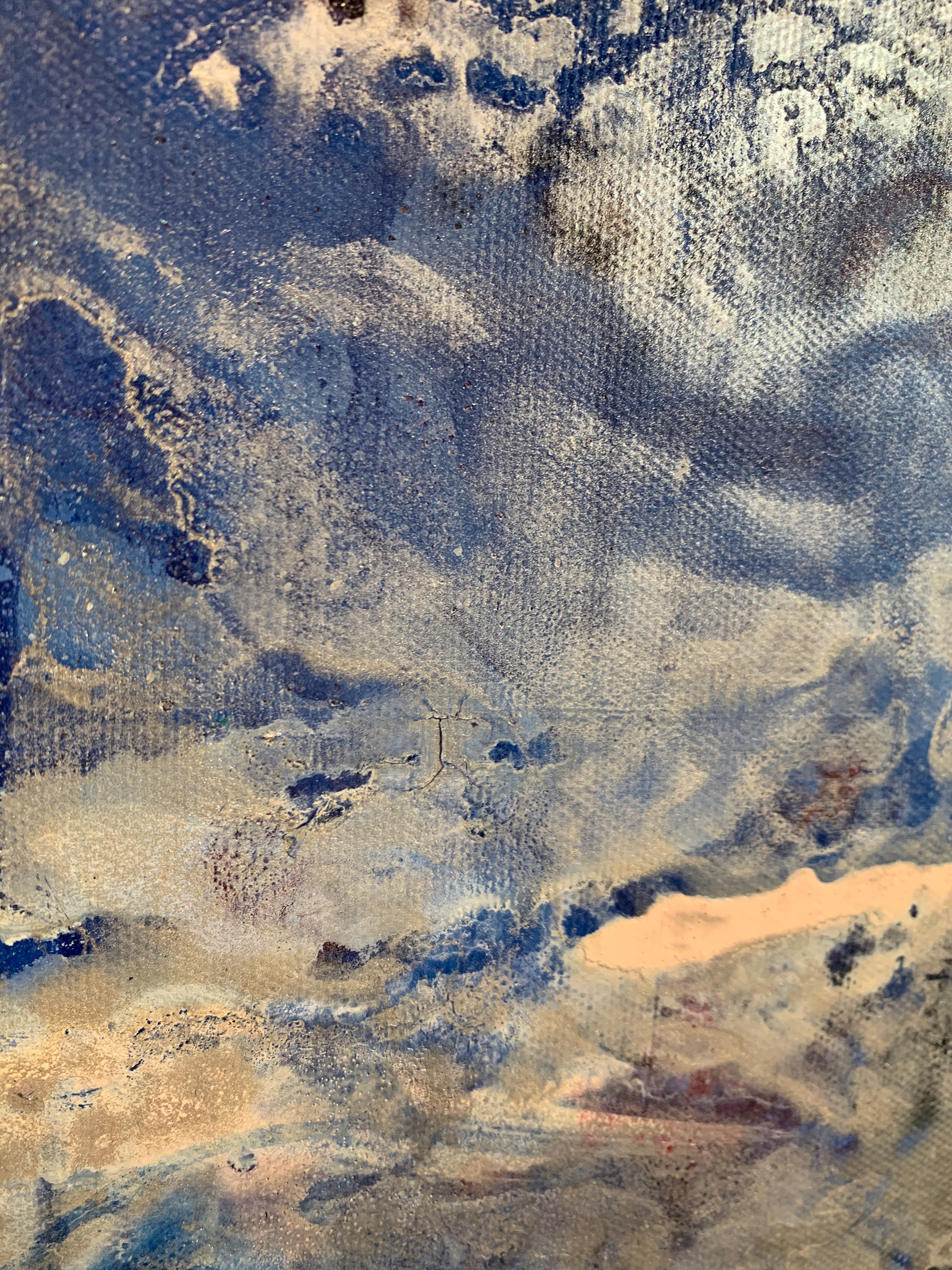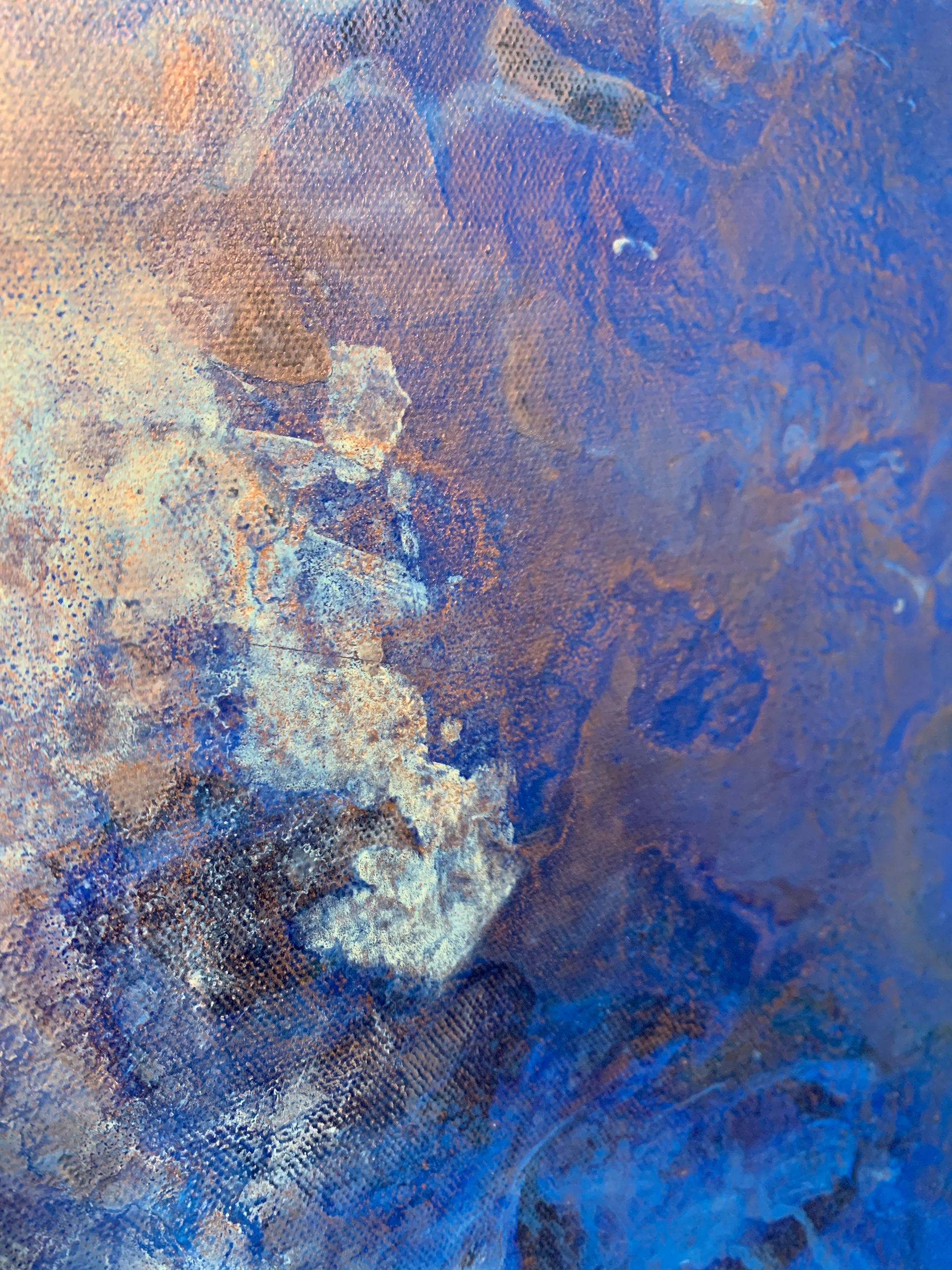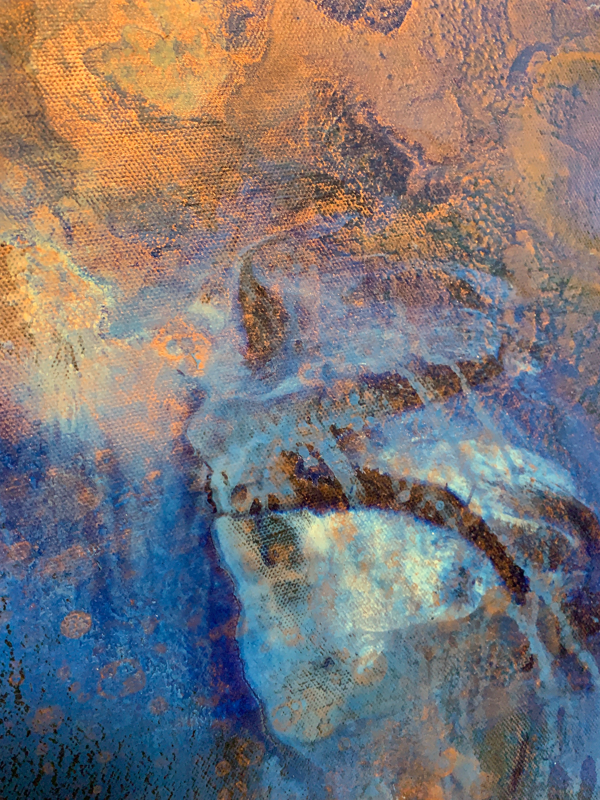 Bei der Herstellung habe ich zunächst die Methode des Acrylic Pouring verwendet und dann die gegossene Acrylfarbe mit einer Spachtel in der Bewegung gesteuert und zusätzlich mit einem Pinsel sowie Auswaschungen verändert. Durch die gezielten Eingriffe hat sich die Zufälligkeit und Willkürlichkeit des Gießens teilweise aufgehoben.