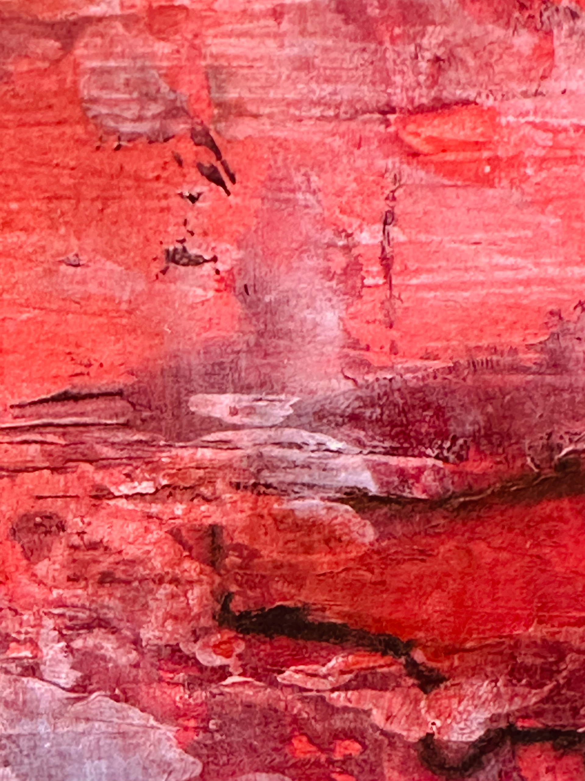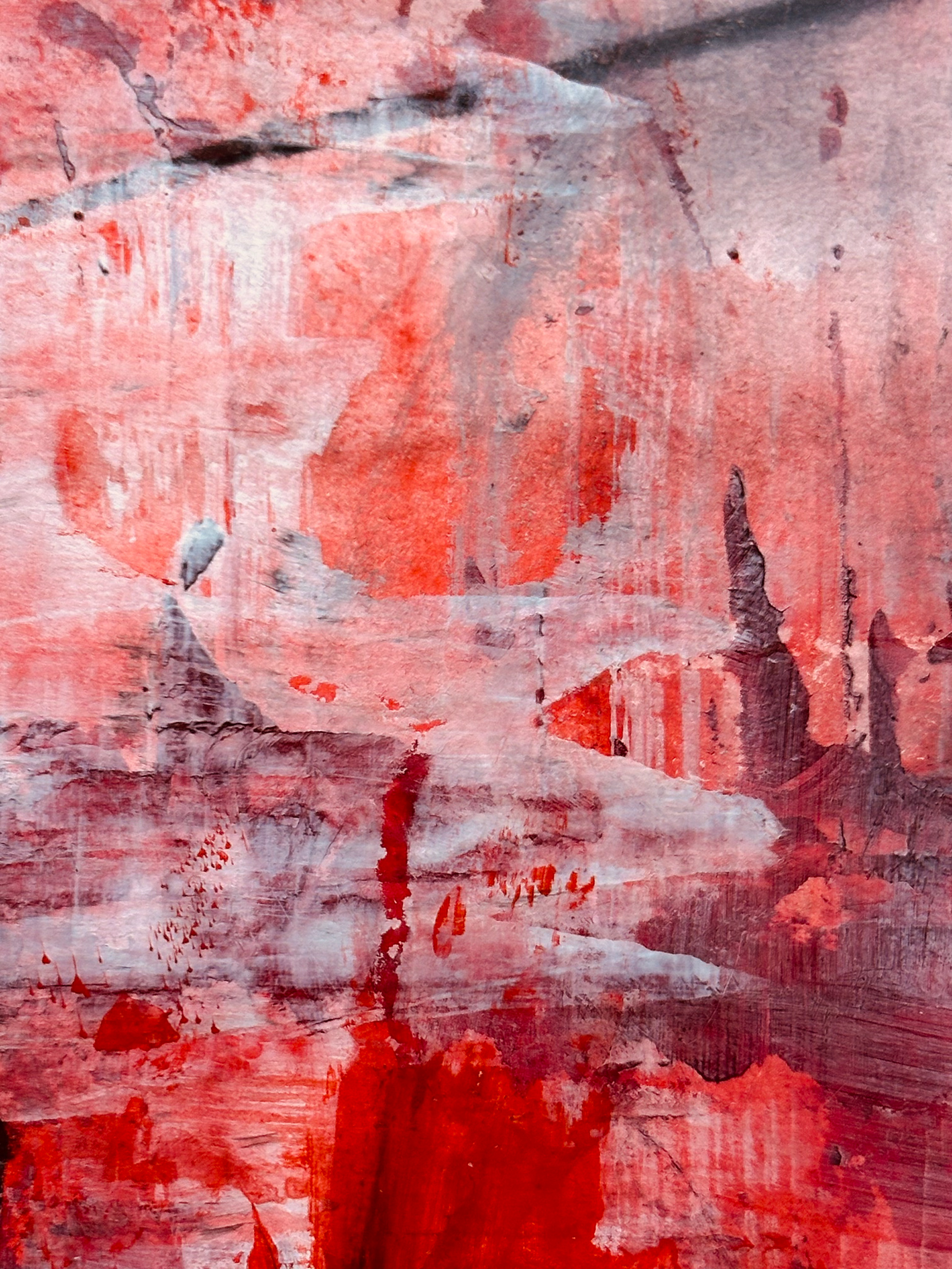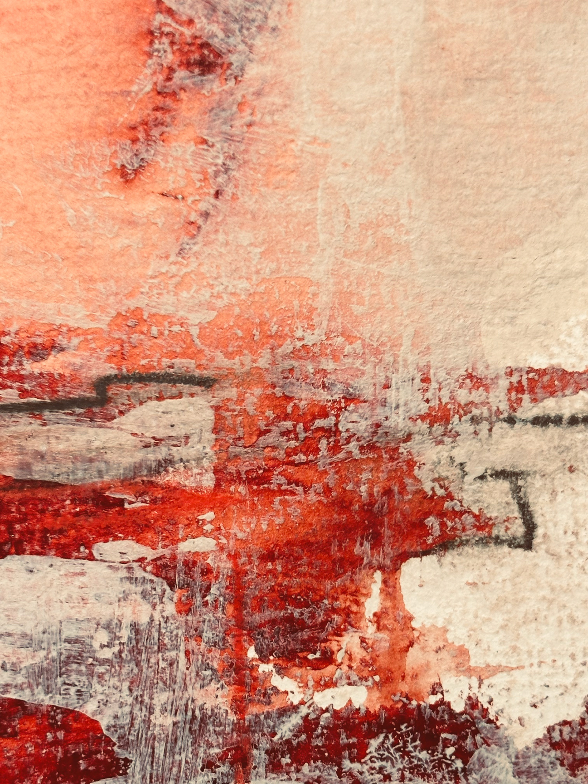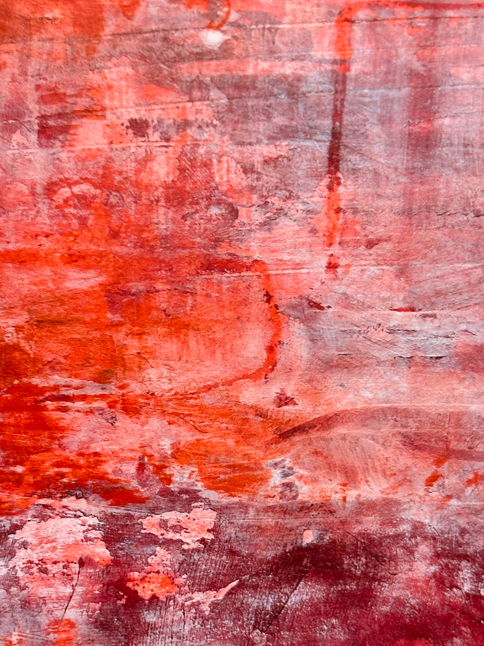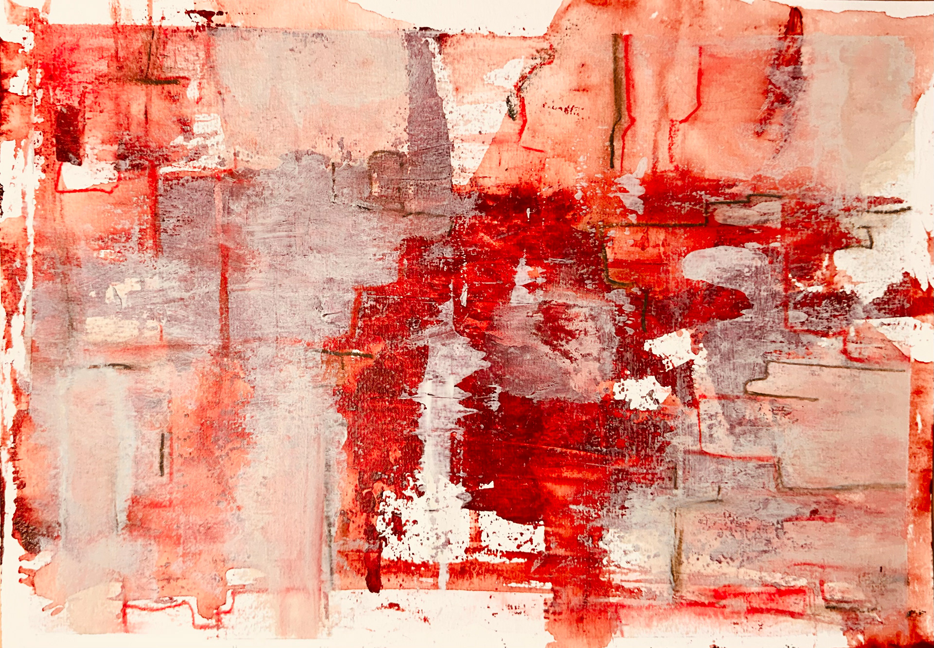 Die malerische Arbeit eines Tages mit einer Farbe: ein flammendes Rot mit Acryl und Spachtel untersucht, mit Pastellkreide Strukturen gesetzt und als Landschaft transformiert.