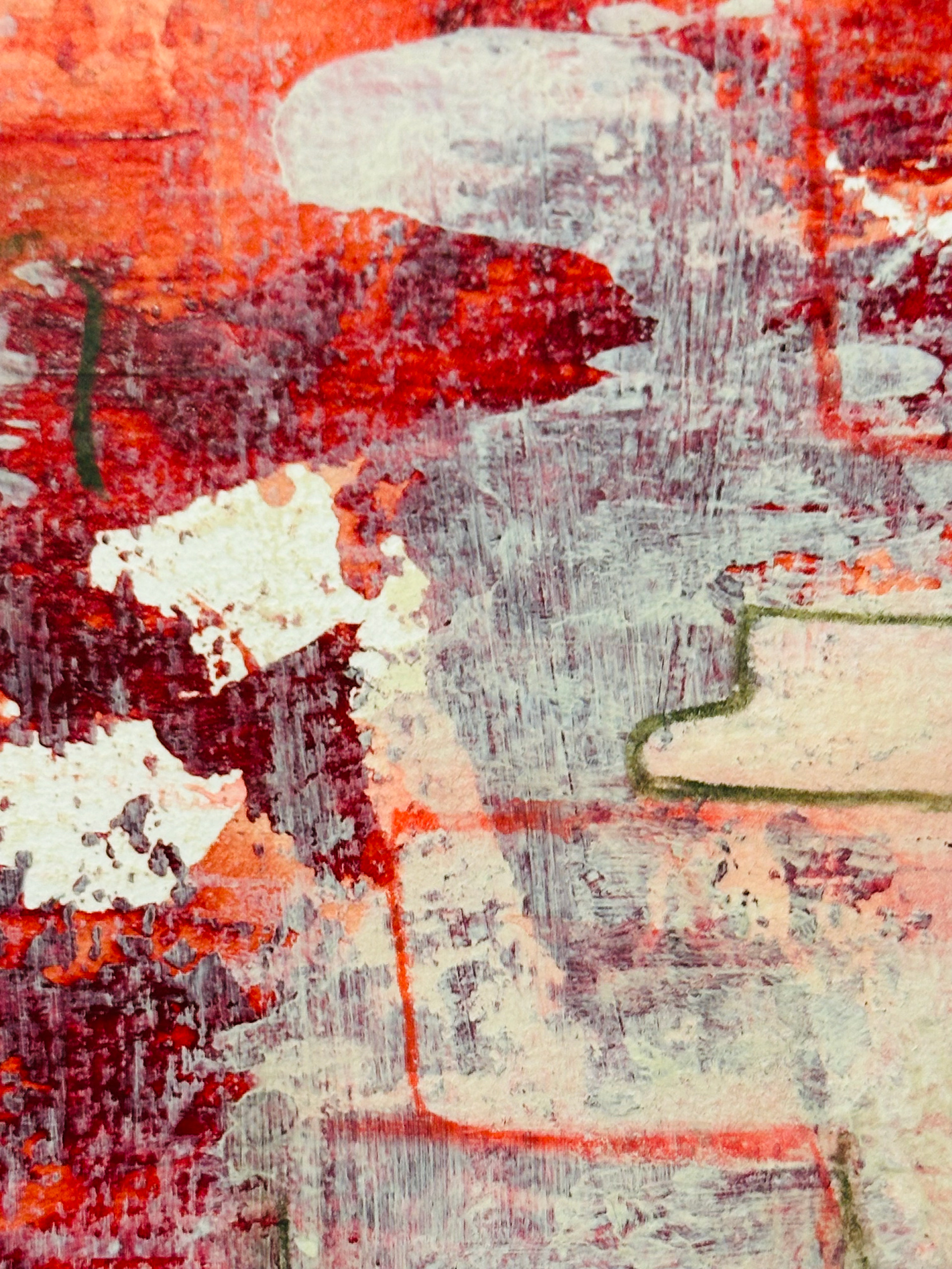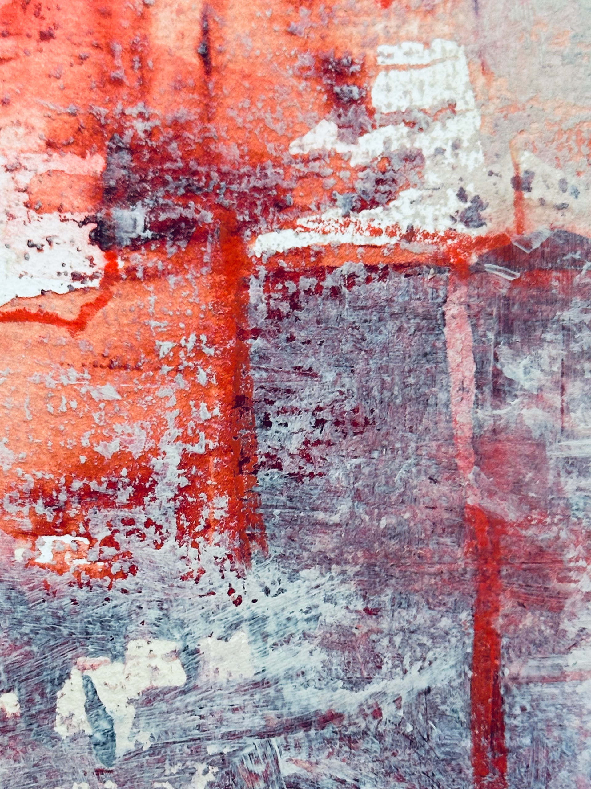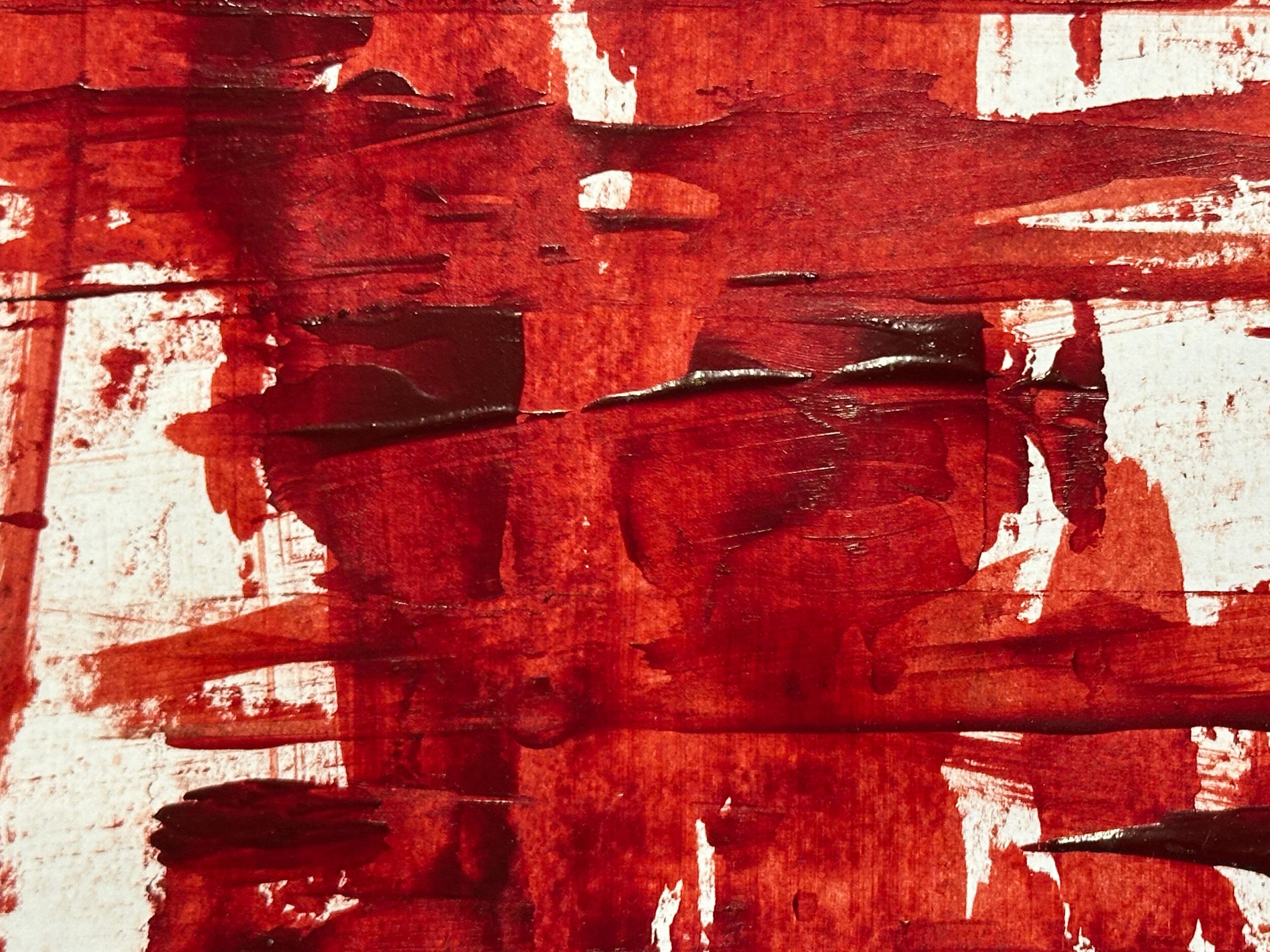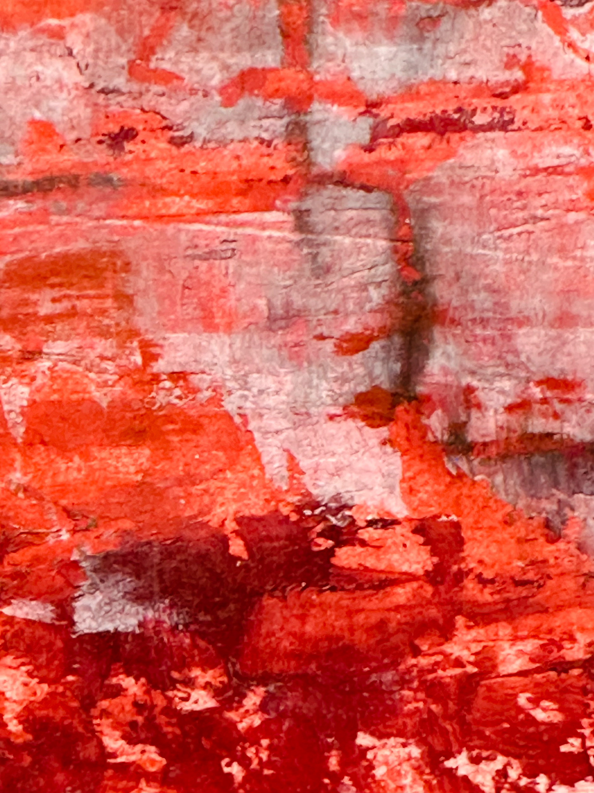 Die malerische Arbeit eines Tages mit einer Farbe: ein flammendes Rot mit Acryl und Spachtel untersucht, mit Pastellkreide Strukturen gesetzt und als Landschaft transformiert.