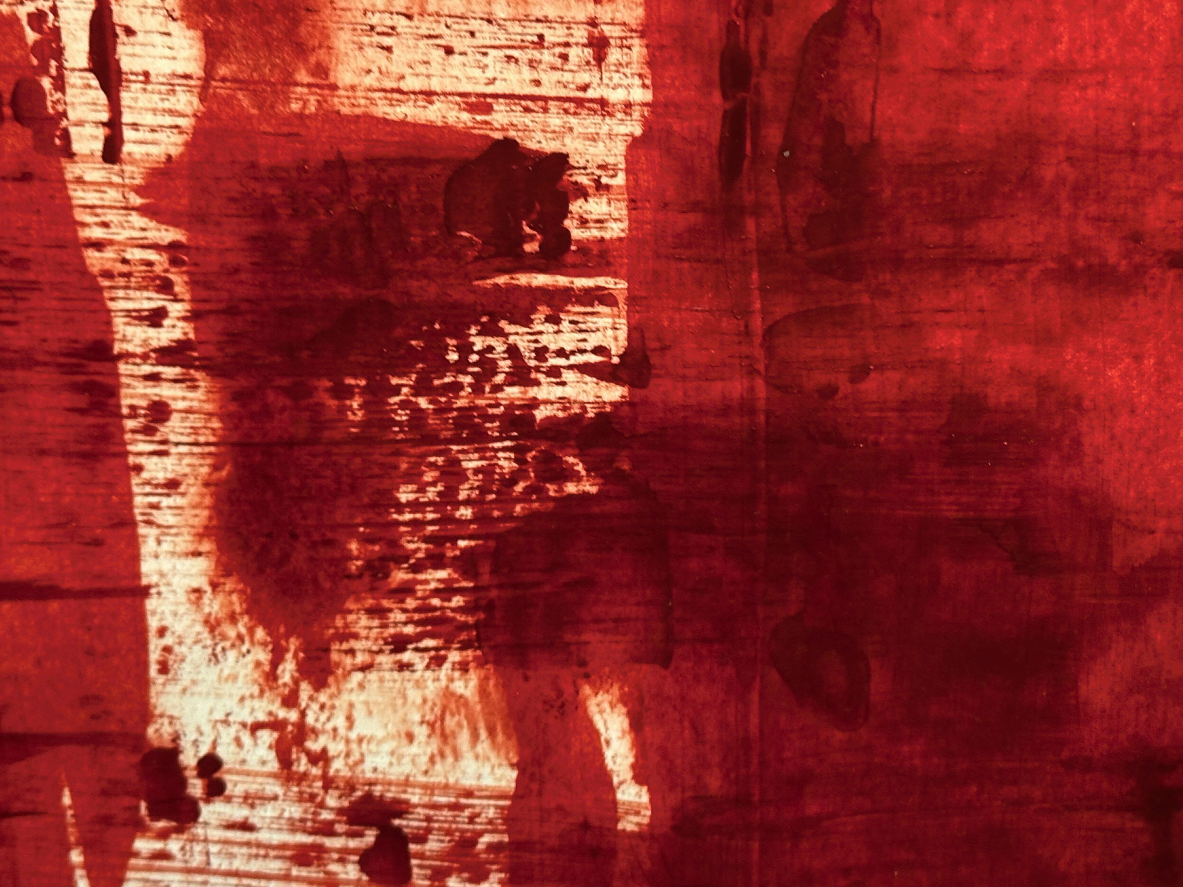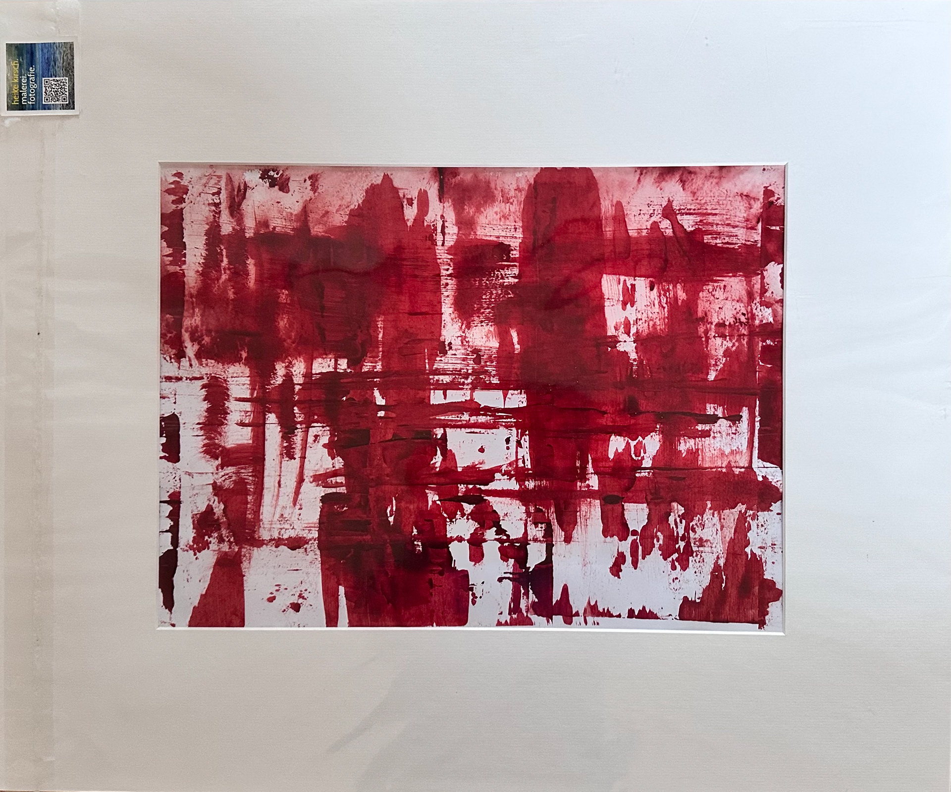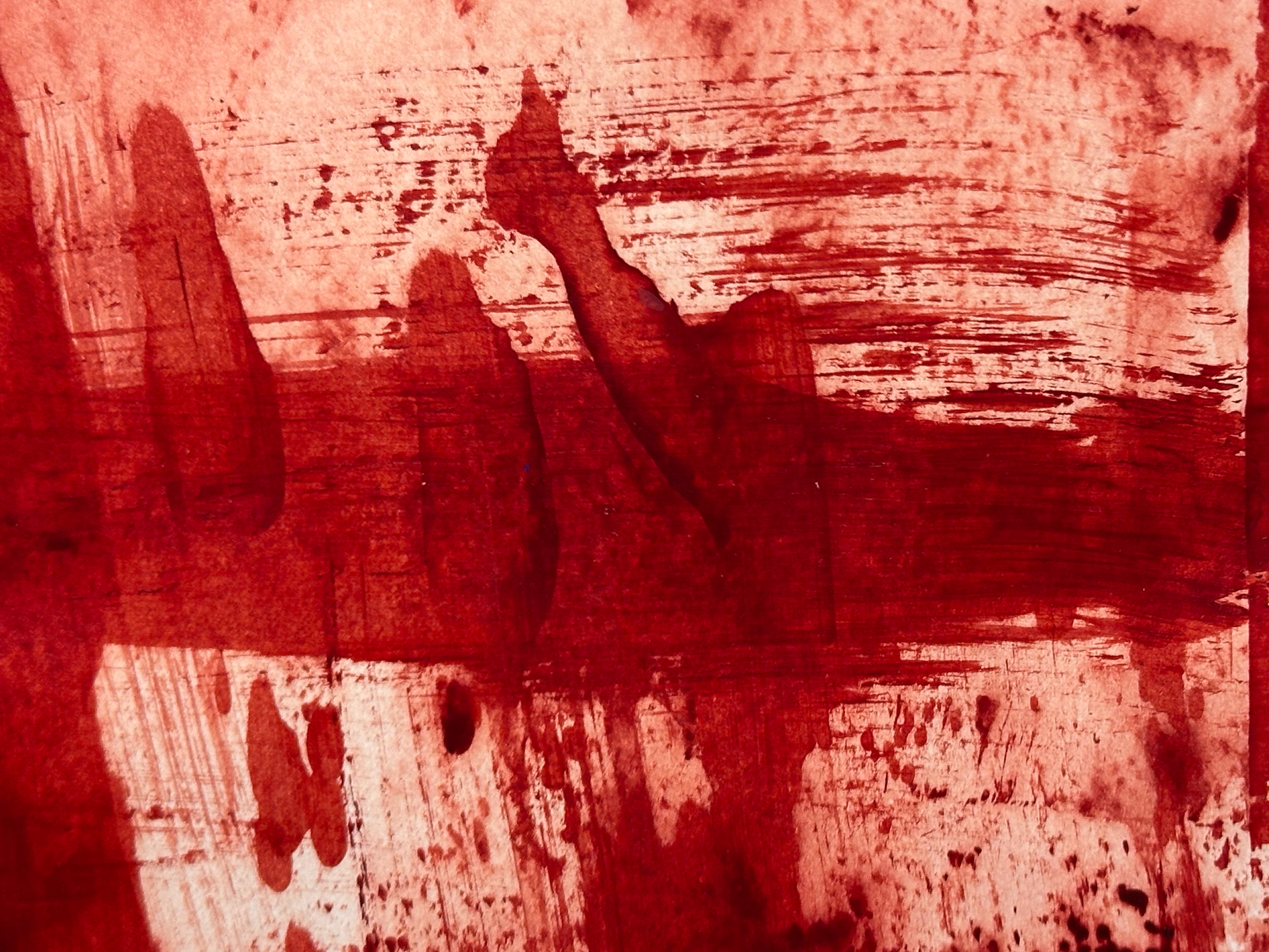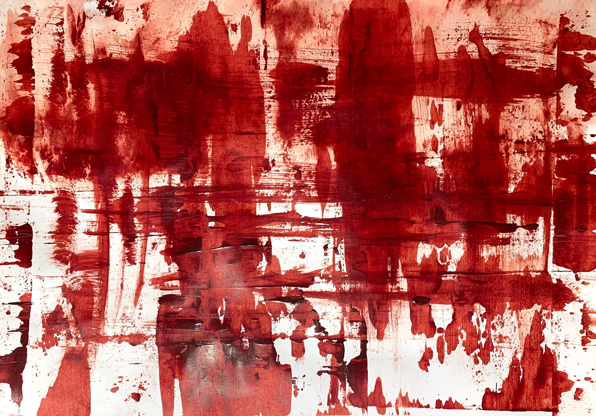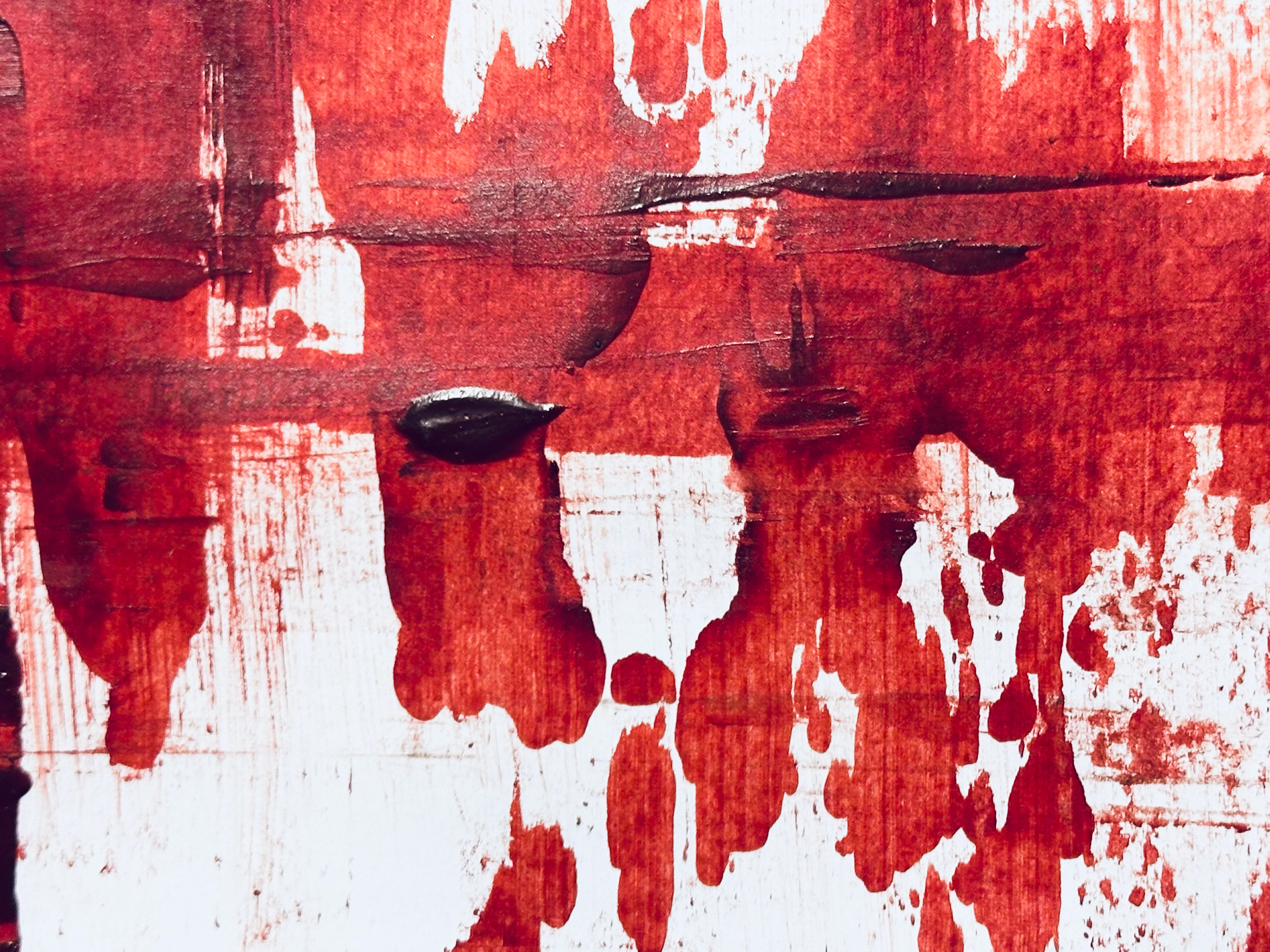 Die malerische Arbeit eines Tages mit einer Farbe: ein flammendes Rot mit Acryl und Spachtel untersucht, mit Pastellkreide Strukturen gesetzt und als Landschaft transformiert.