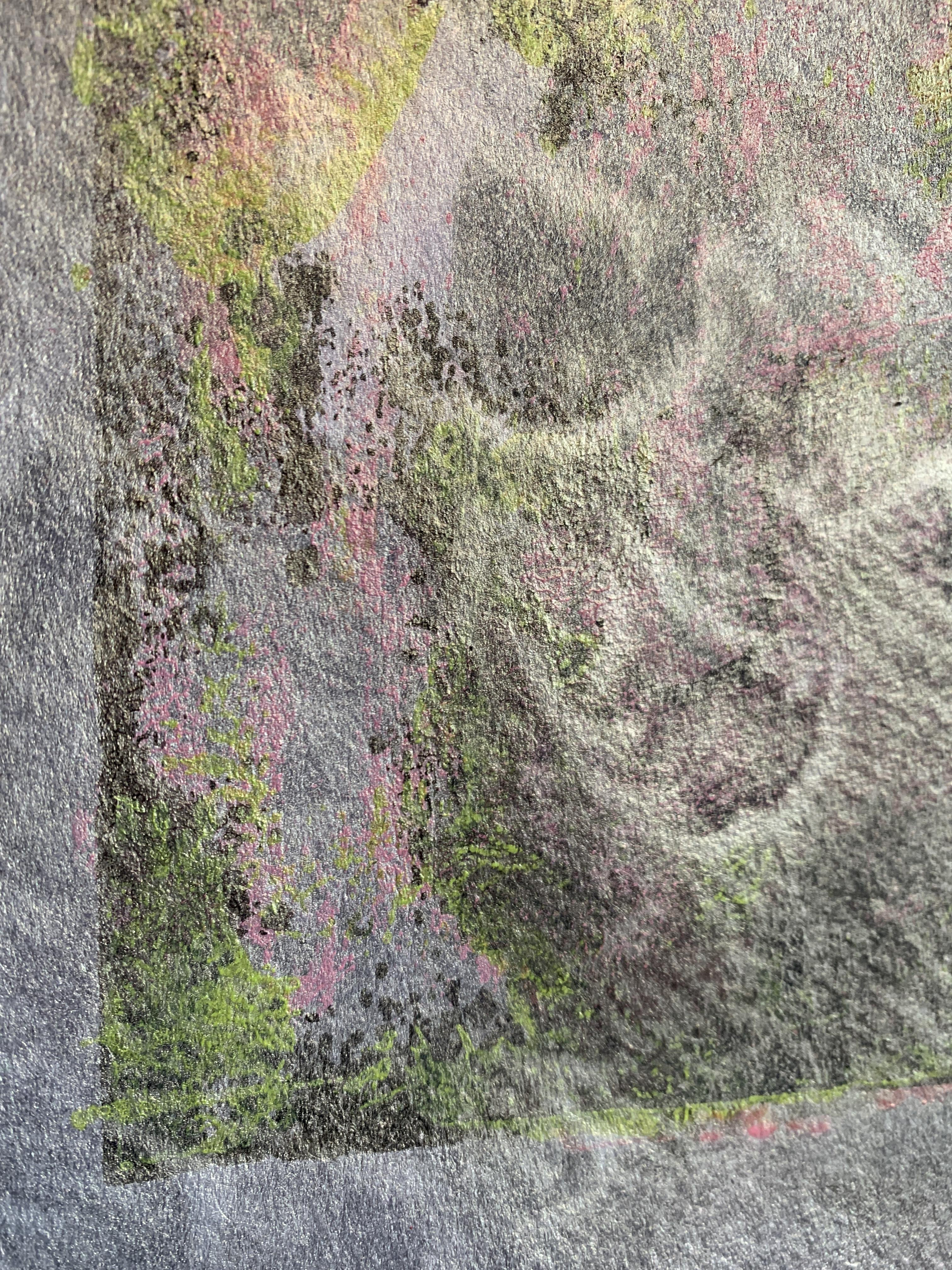 Die Bildgestaltung erfolgte hier als einmaliger Druckvorgang, ich habe alle Farben aufgetragen, dann die Holzplatte komplett auf das Papier gelegt und durch meine Handballen auf das Papier gepresst.