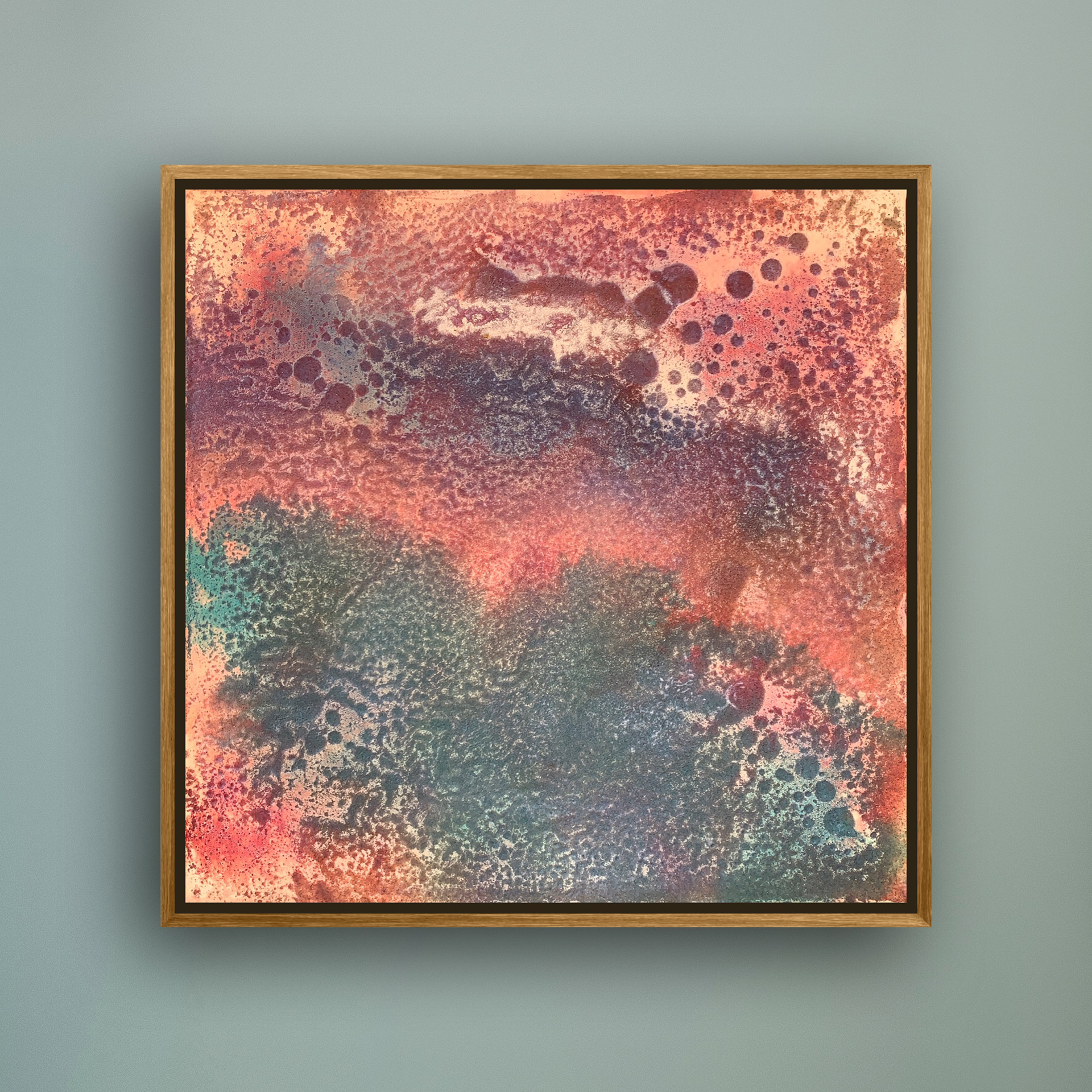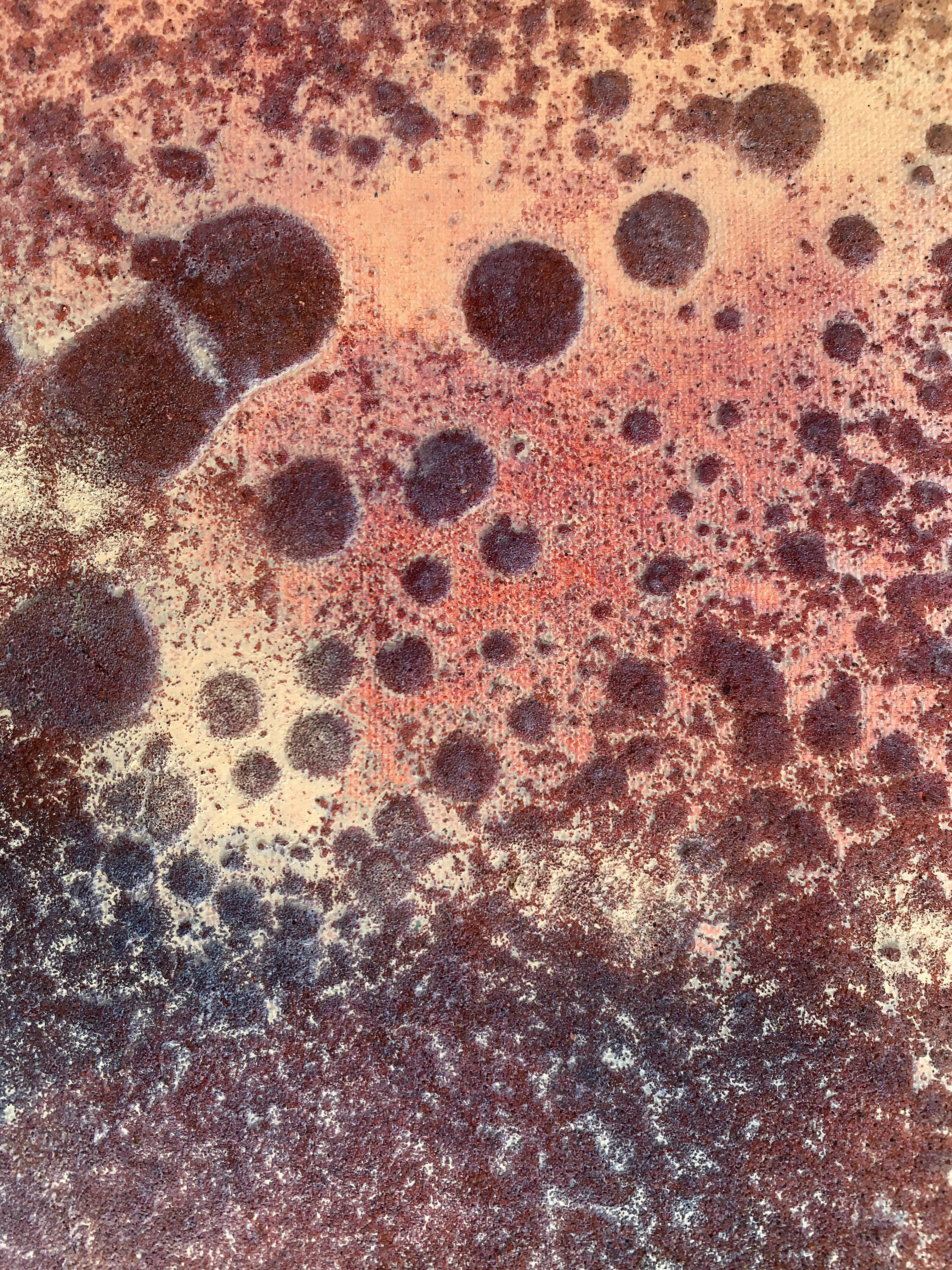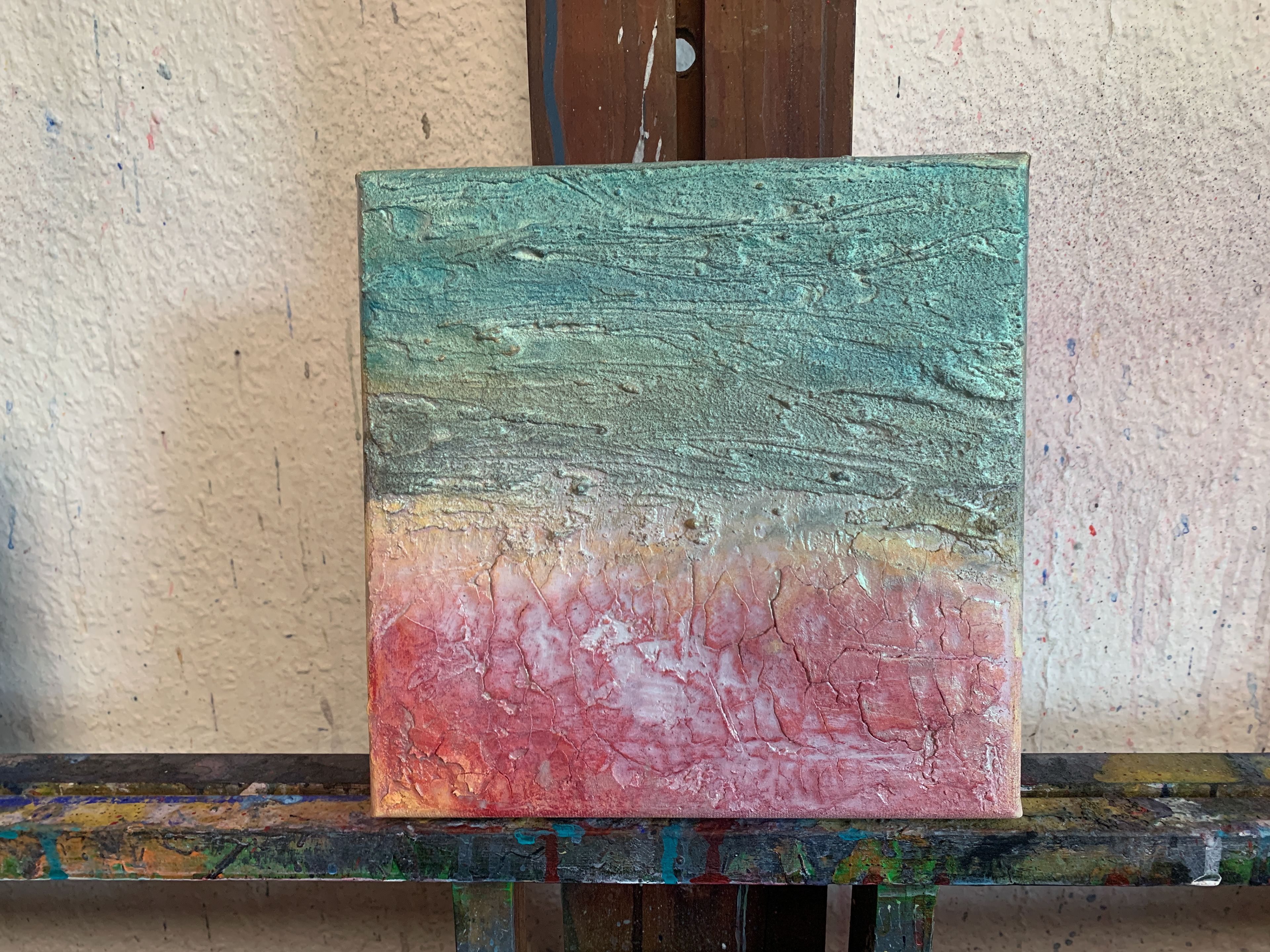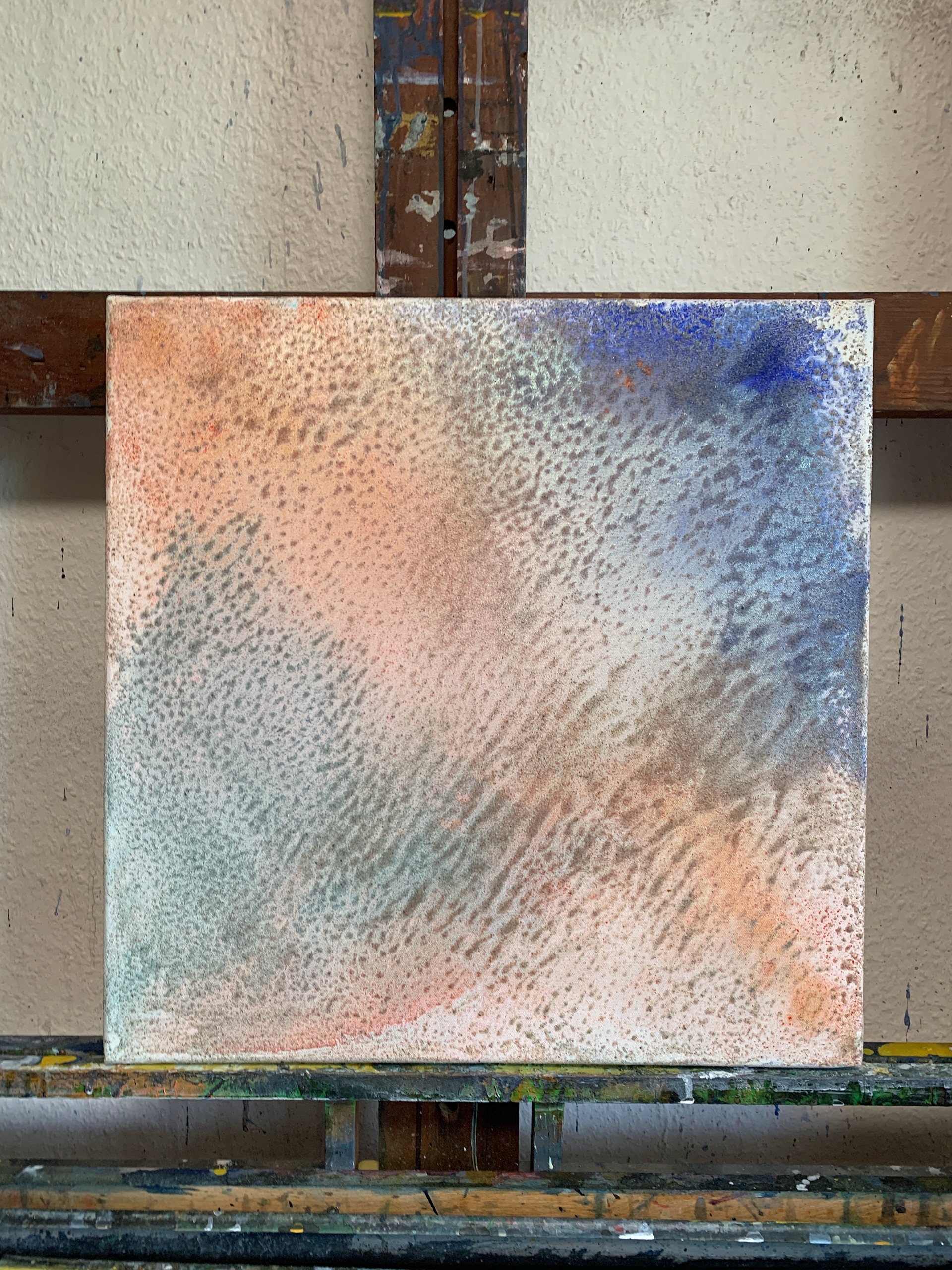 Mit Blick auf die Ostsee habe ich beim Arbeiten in die stündlich wechselnden Farben am Strand, im Wasser und Himmel eintauchen können. Das habe ich auch fotografisch in den Pausen eingefangen und die faszinierenden Farben finden sich in den Struktur-Arbeiten wieder. So sind alle Tageszeiten vom klaren, blauen Morgen über wolkige, pastellfarbene Mittagszeiten bis zum warmen, roten Sonnenuntergang in den Arbeiten zu sehen und deren Farben ich durch einen lasierenden, halbdeckenden oder cremig festen Farbauftrag entsprochen habe.